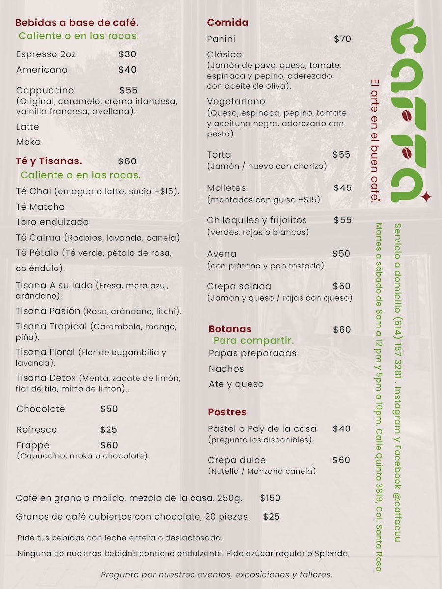 Welcome to Caffá, an enchanting art café located in the heart of Santa Rosa, Chihuahua, Mexico. This vibrant spot harmoniously combines the appreciation of art with the love of exceptional coffee and delightful food. Nestled at C. Quinta 3819, 31050 Chihuahua, Caffá is not just a café; it's an experience that invites you to slow down, unwind, and indulge your senses.